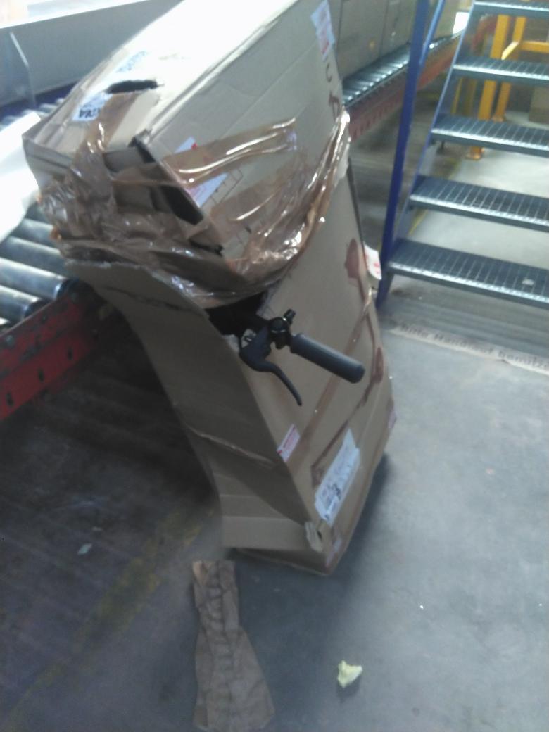 Beispiel 1: In diesem Fall hat GLS den Transport abgelehnt, da Teile des Scooters aus der Verpackung herausragten und das Paket geöffnet war. Ein Mitarbeiter muss das Paket bei GLS vor Ort abholen.
